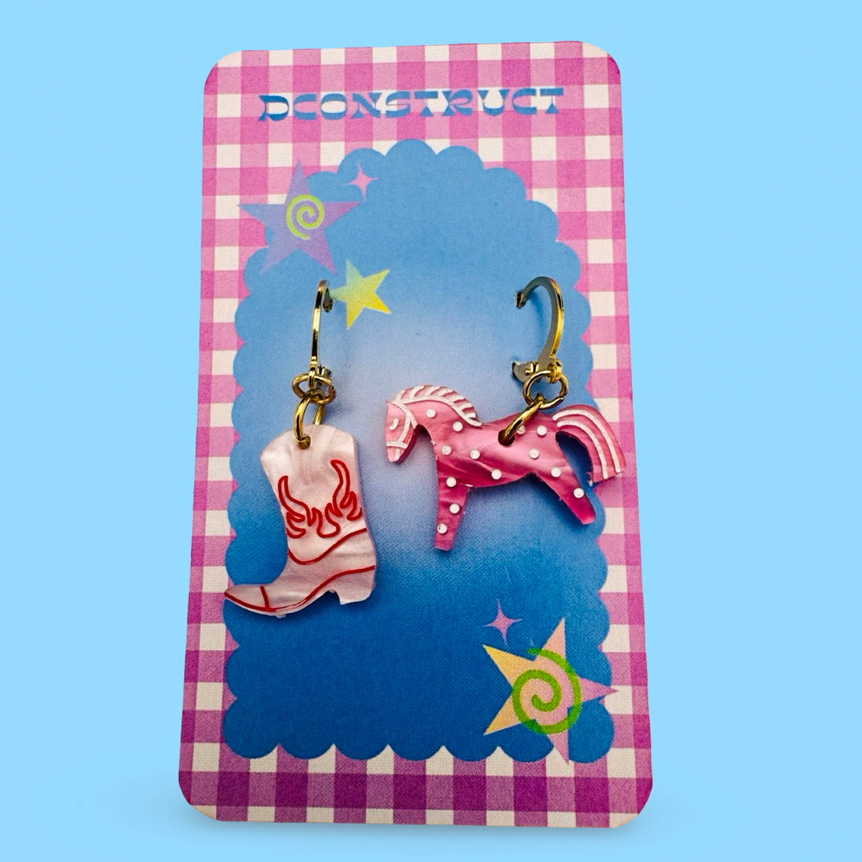 Saddle up with our Horse and Boot Charm Earring Set—a rootin' tootin' tribute to Western spirit and frontier flair. These charming earrings celebrate the iconic pairing of cowboy boots and trusty steeds, perfect for rodeo fans, horse lovers, and anyone who embraces their inner cowpoke. Lightweight and full of character, they dangle with playful Western charm that's sure to turn heads. Whether you're channeling ranch vibes, dreaming of wide-open spaces, or just love accessories with attitude, these earrings deliver style with a lasso-full of personality. Giddy up and show the world you've got that cowboy spirit!