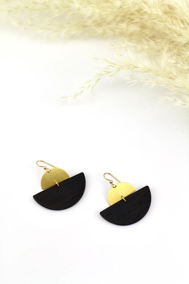 These geometric statement earrings are lovingly handmade with brass, reclaimed wenge wood and hung on 14K gold fill hooks.